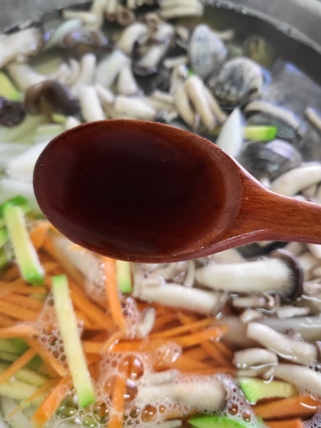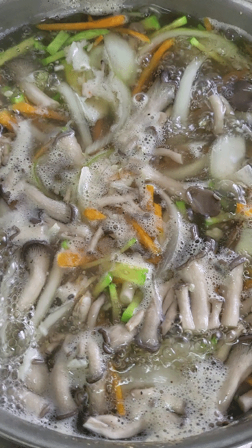 ▶ 재료 : 육수용(다시마, 무, 양파, 멸치), 버섯, 당근, 애호박, 양파, 간마늘, 바지락, 칼국수면, 국간장, 기호에따라 후추