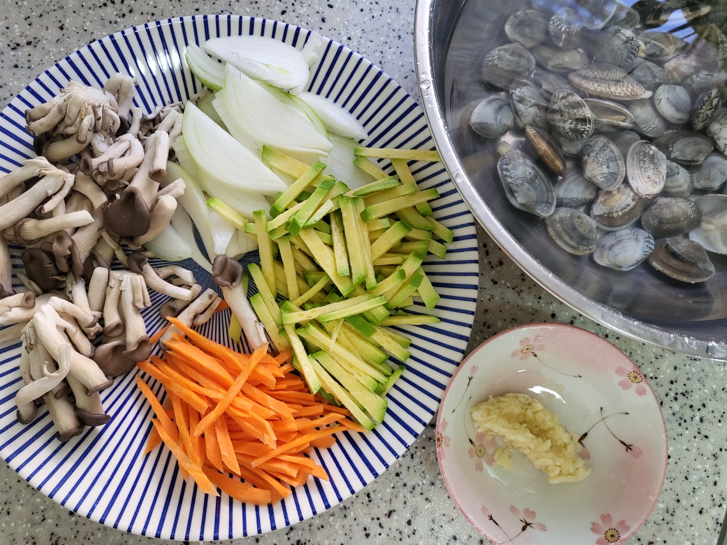 2. 육수 끓는 동안 바지락해감, 야채손질, 간마늘을 준비해주세요.