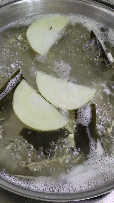 1. 먼저 육수를 내주세요. 양파, 멸치, 무, 다시마 넣고 끓여주시면 됩니다.