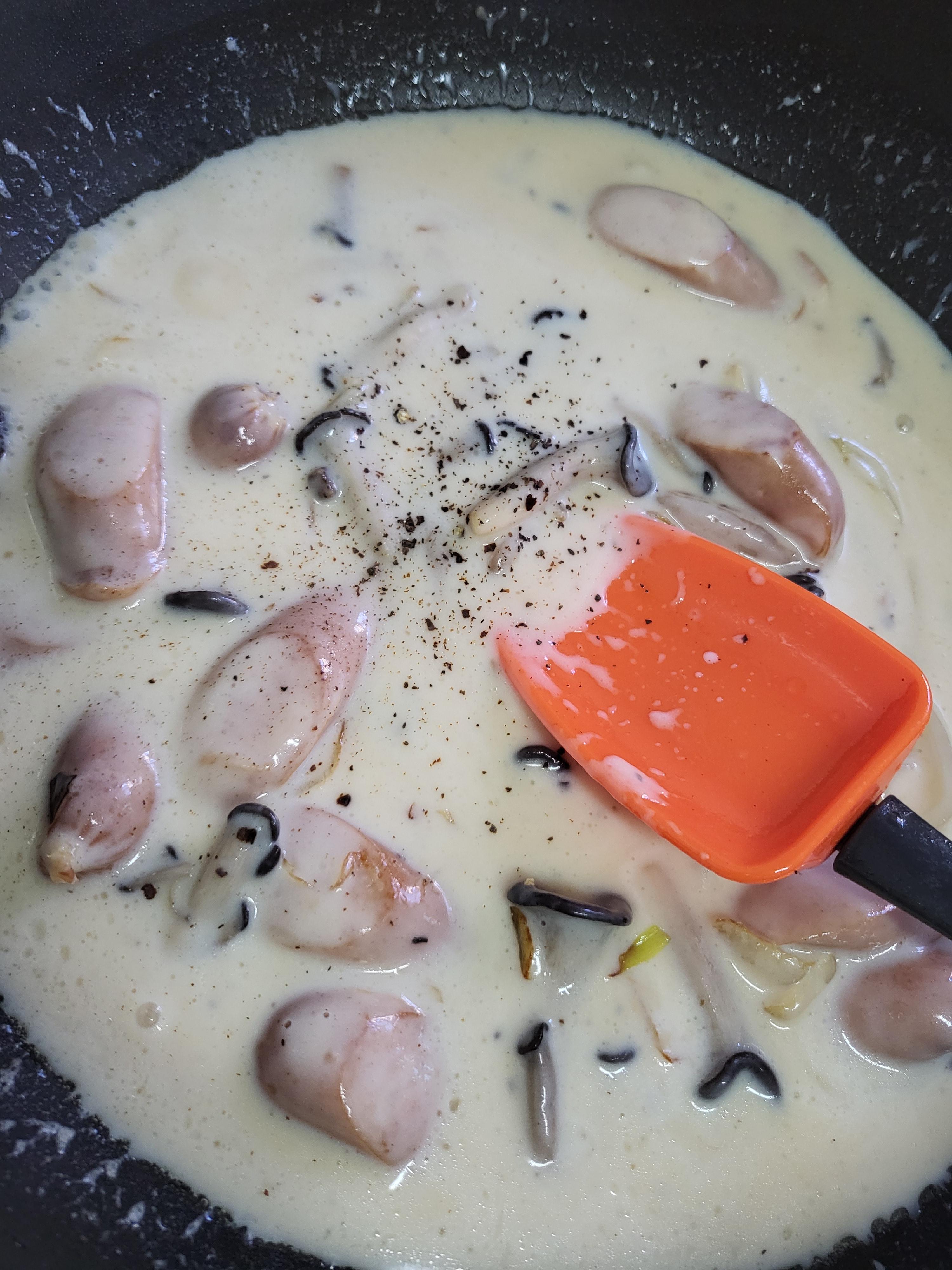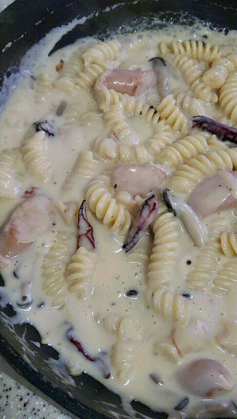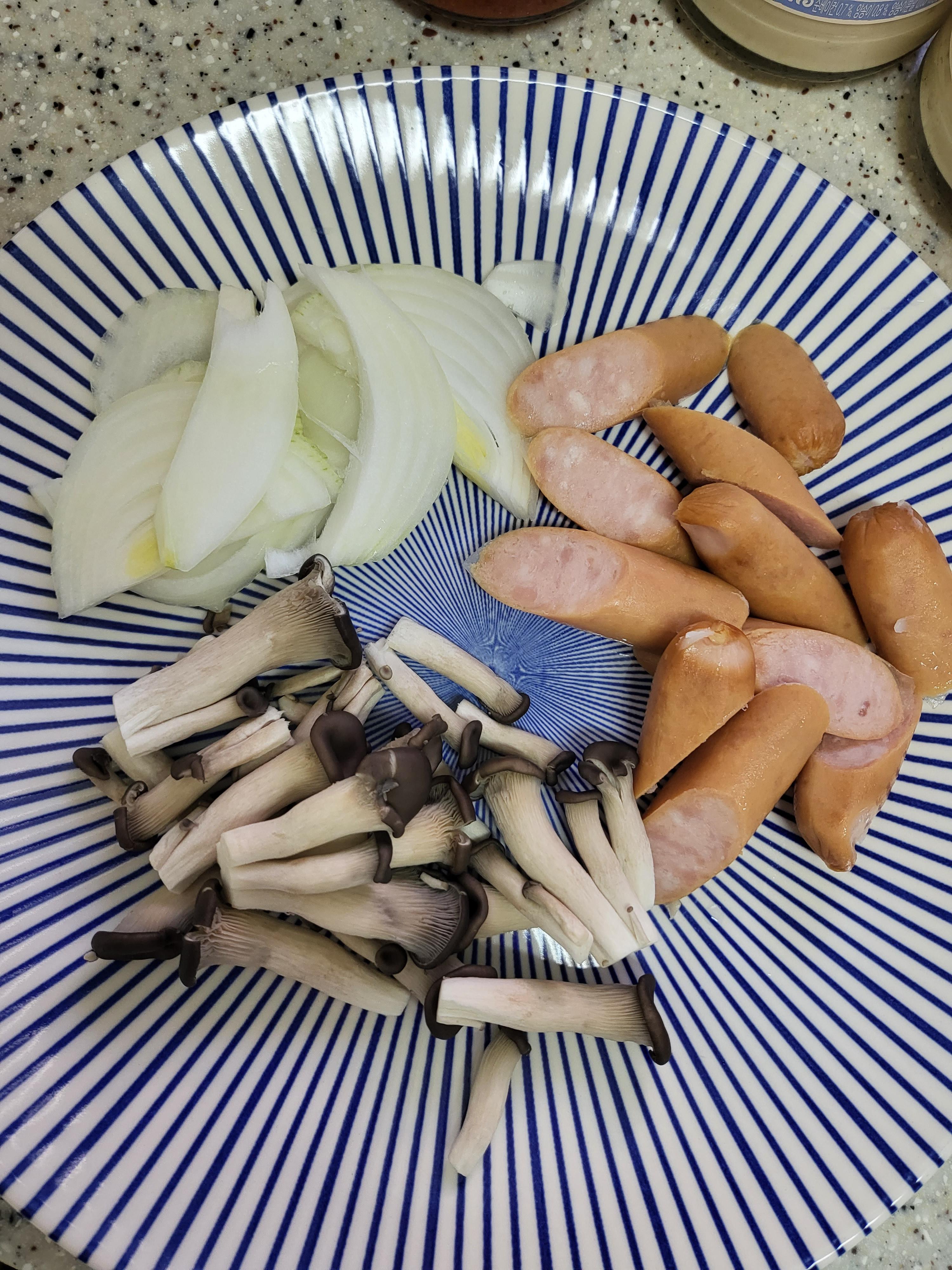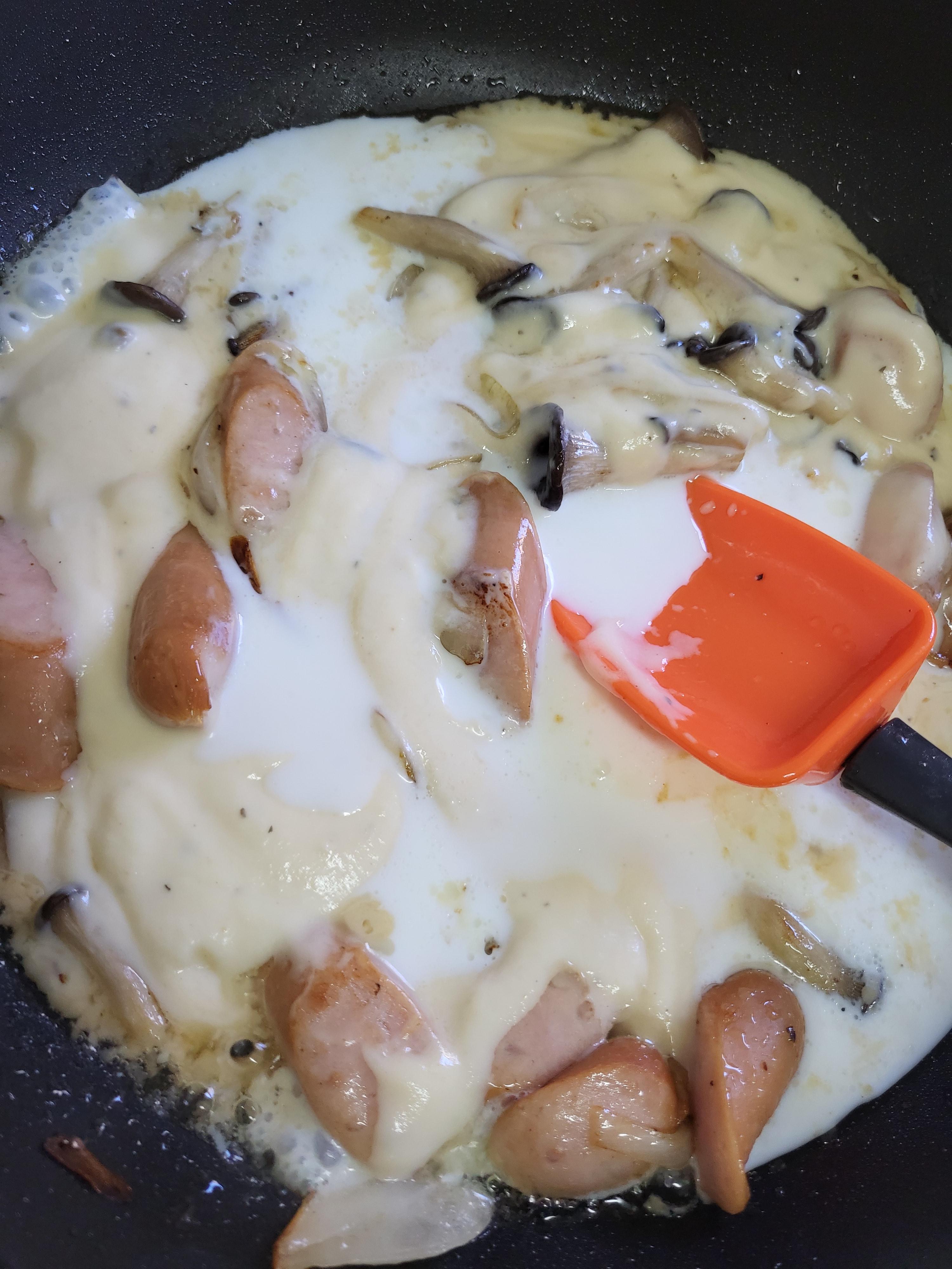 파스타면, 시판 파스타소스, 우유 종이컵 한잔 정도, 양파, 버섯, 소시지, 버섯, 소금, 후추 (들어가는 재료는 각자 취향에 따라 바꿔주세요), 베트남고추(생략가능)