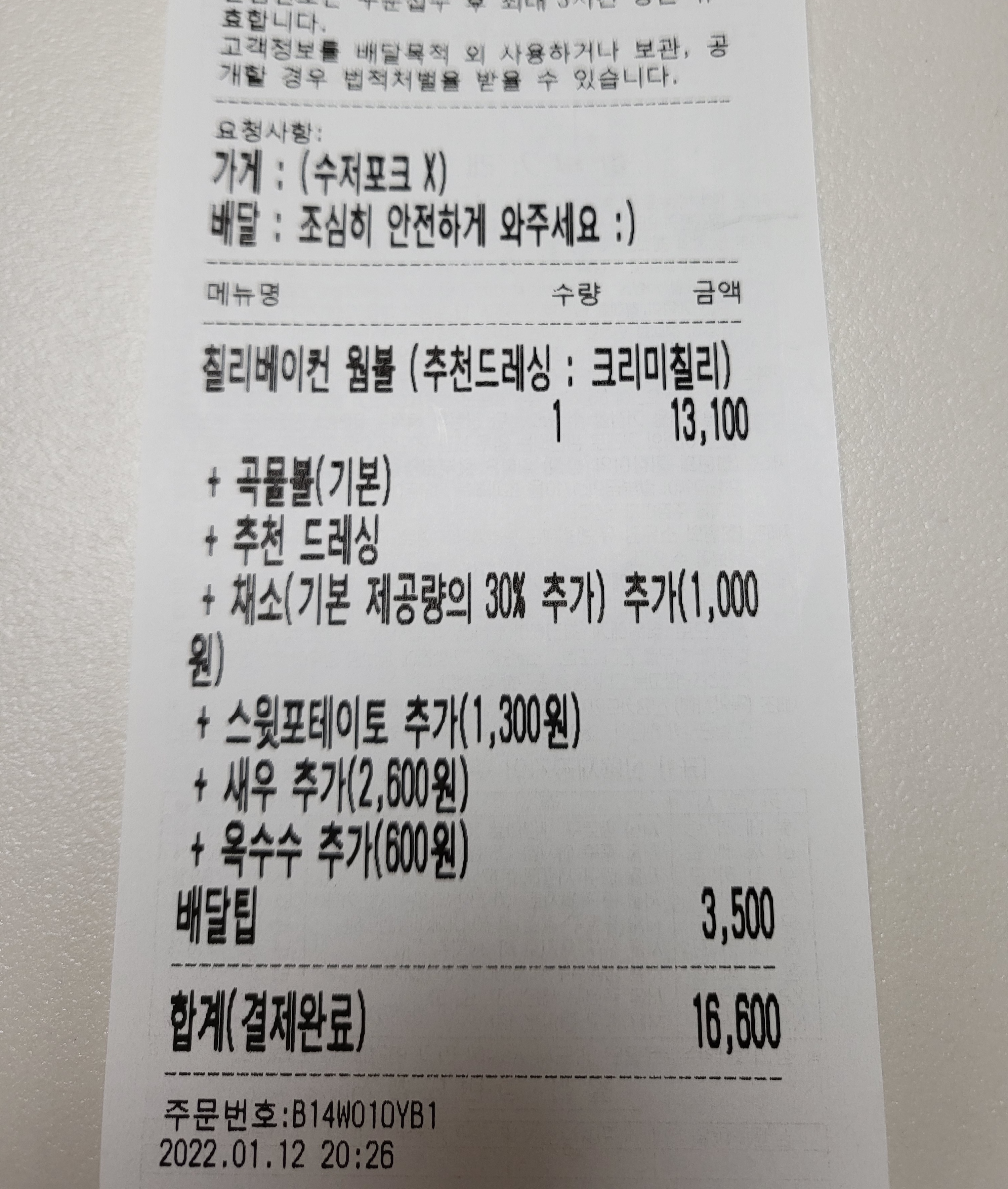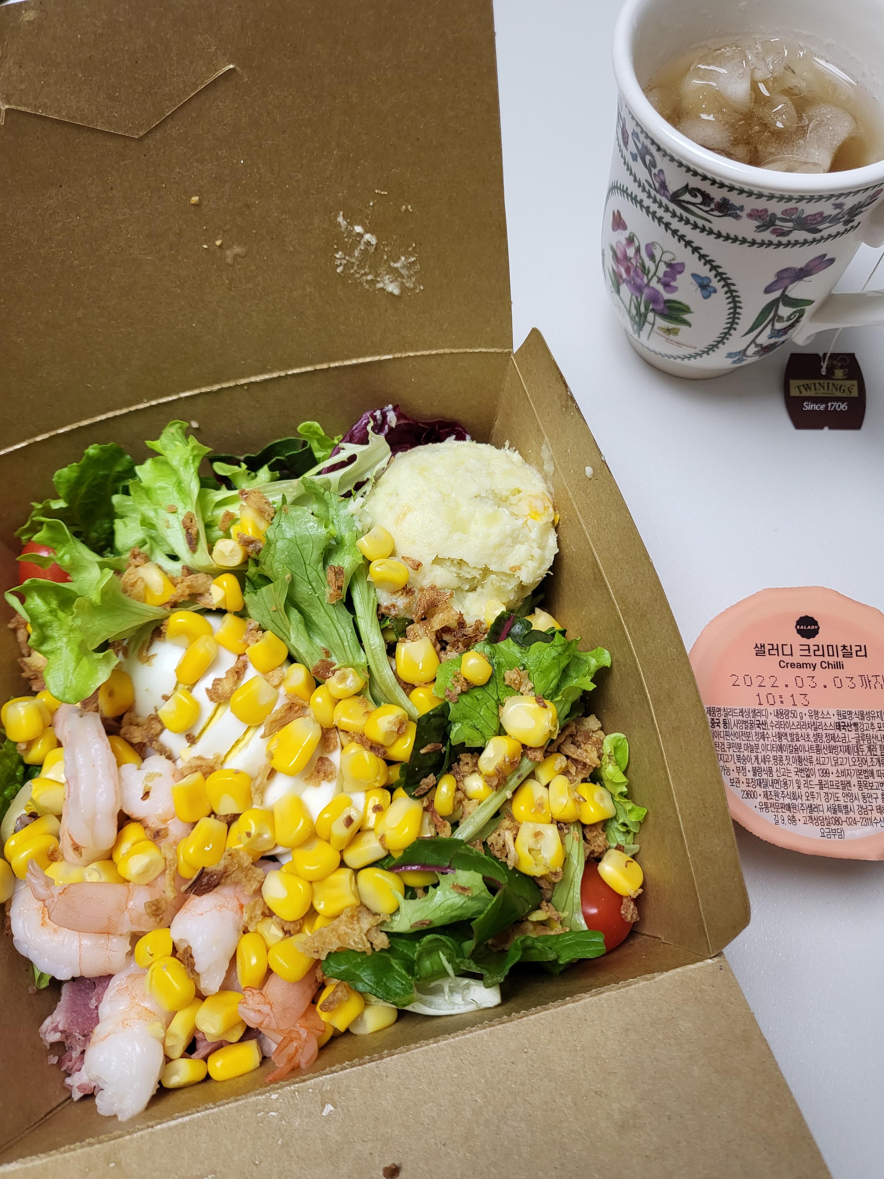 예전에 시켜먹었을 때 채소가 부족했던 것 같아 채소 추가, 스윗포테이토, 새우, 옥수수를 추가해보았습니다. 이것 저것 추가하니 한끼 샐러드 가격이 ㅎㄷㄷ.....🥲 그래도 맛있으면 장땡!!!!ㅎㅎㅎㅎㅎㅎㅎㅎㅎㅎ