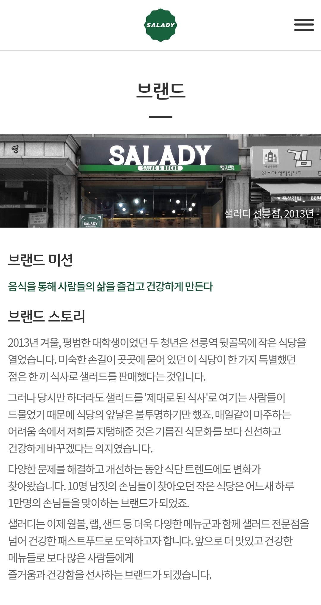 건강한 패스트푸드 샐러디입니다. 메뉴, 영양정보, 매장 안내