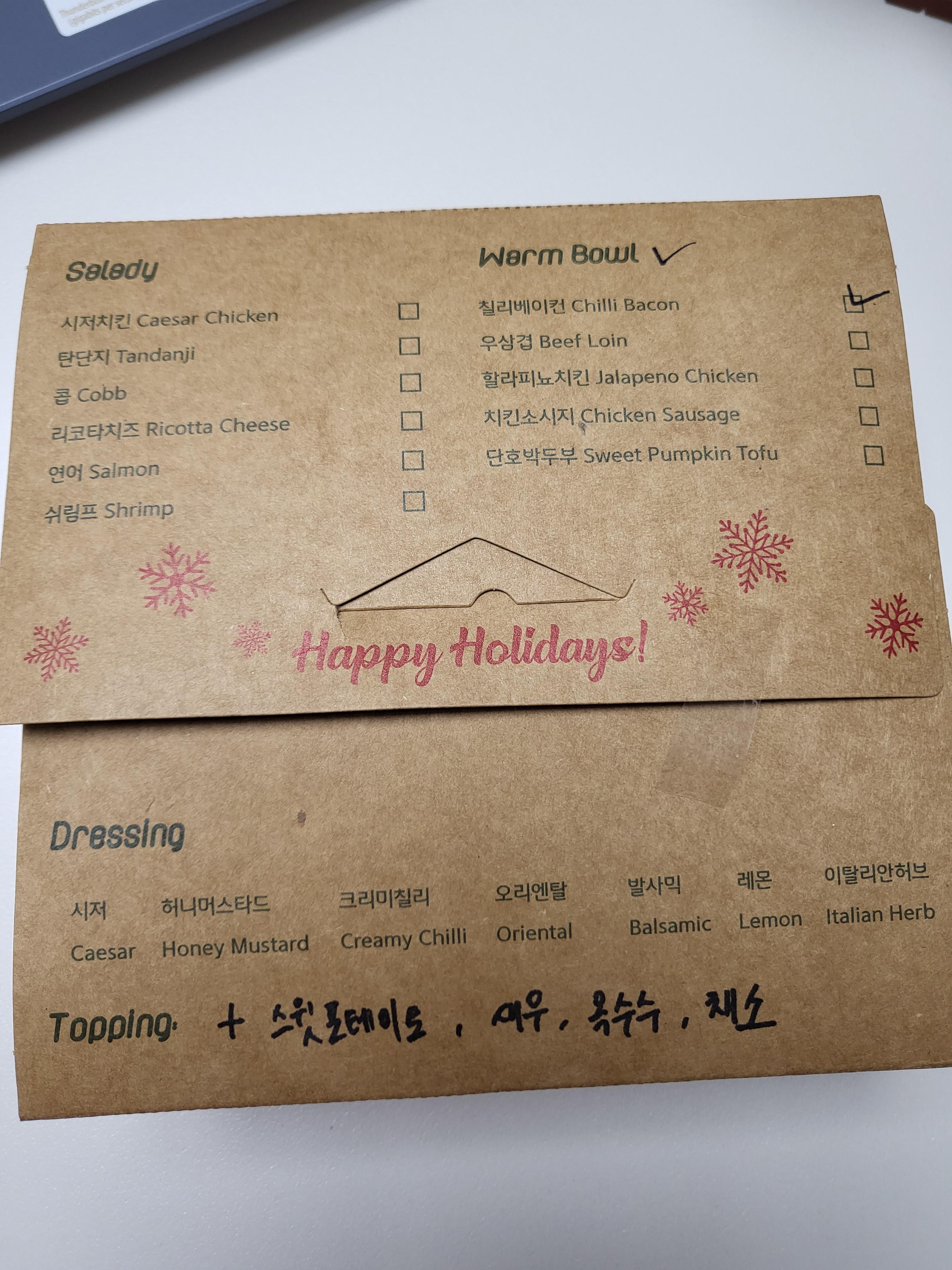 포장박스를 보시면 아시겠지만 샐러디, 웜볼을 선택해주시고 원하시는 드레싱을 선택해주시면 돼요. 토핑추가는 원하시는대로~~~~~~~^^