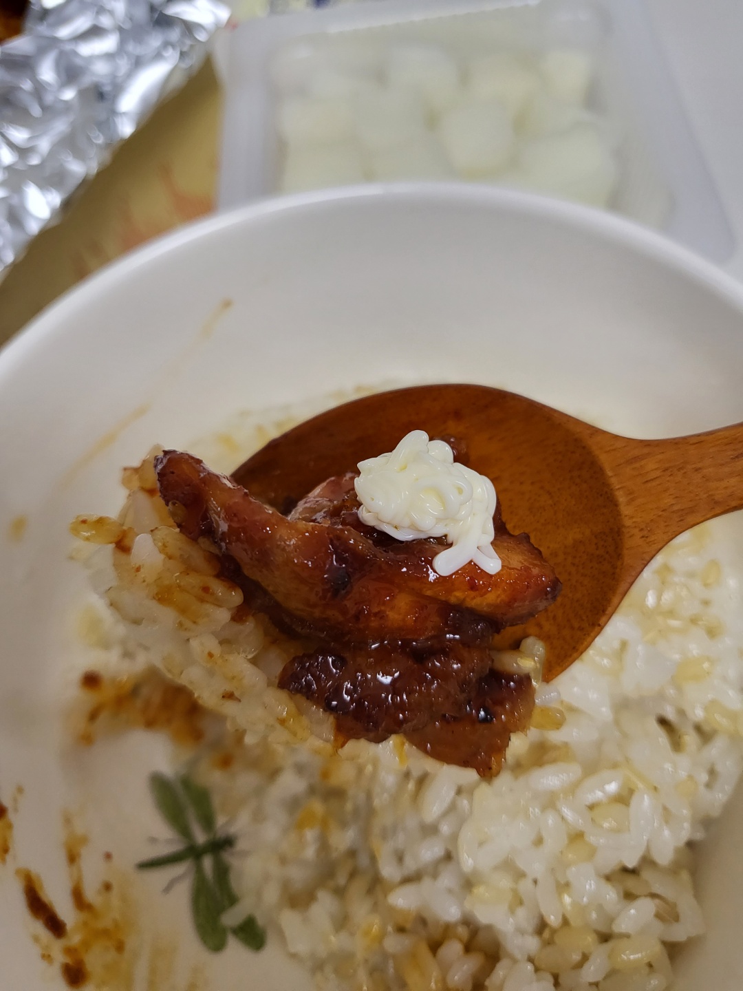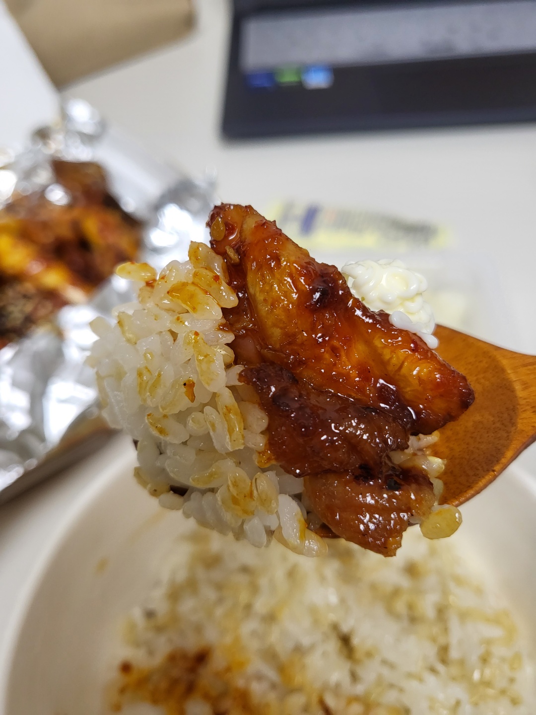 꼬들꼬들한 현미밥에 스윽 순살치킨 올려서 한입😋