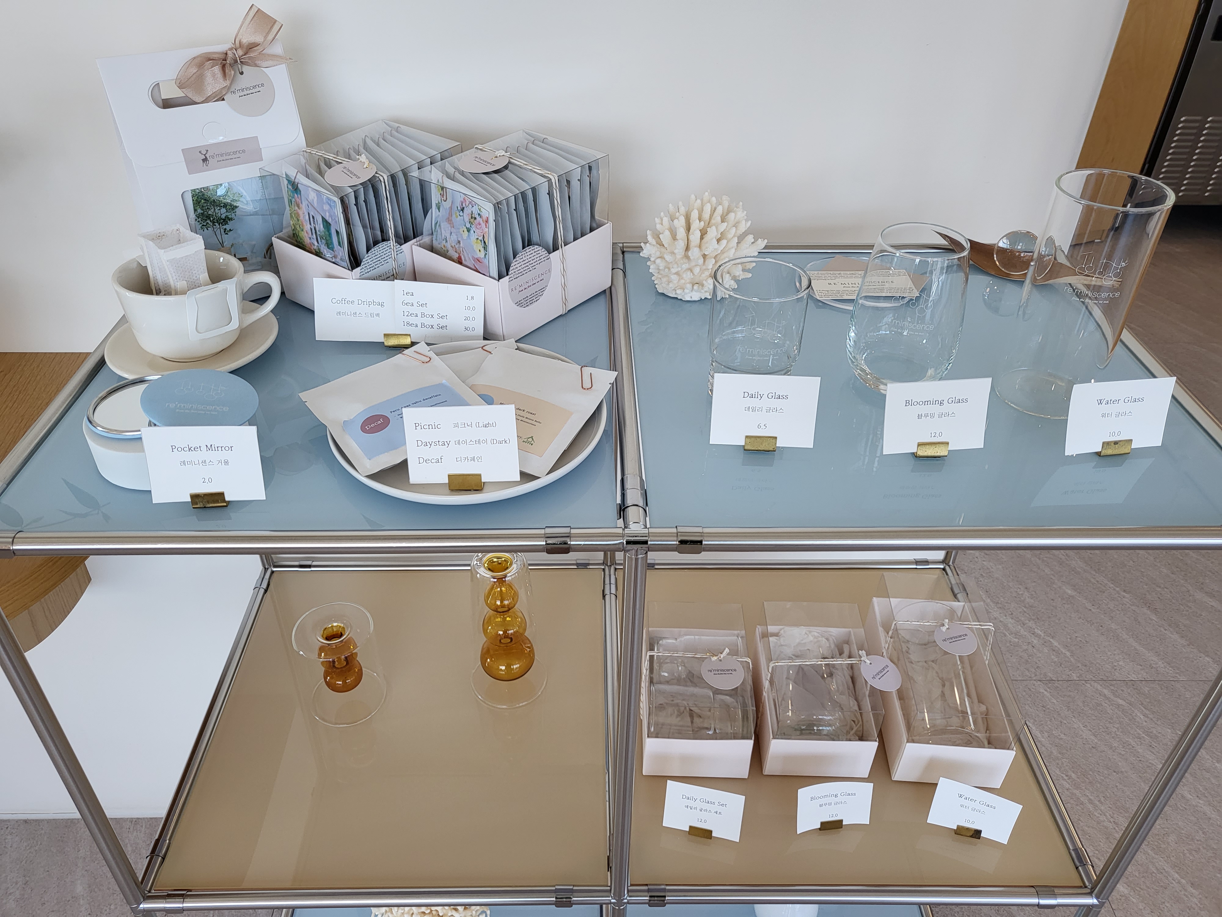 또 한쪽에는 레미니센스 드립백들과 레미니센스 로고가 쓰여 있는 유리잔까지😄 이때는 커피를 먹어보지 못했지만 다음에 가면 커피 한잔을 꼭 먹어봐야겠어요! 맛있는 커피에 레미니센스 케이크 한조각이면 세상 행복할 것 같단말입니다!!🧡