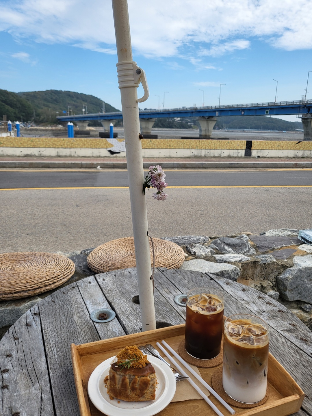 케이크와 커피. 맛도 맛이지만 이렇게 바로 선재대교를 바라볼 수 있는 풍경이 있기에 더 맛있었던 것 같아요. 오랜만에 힐링한 것 같은 느낌이었답니다.