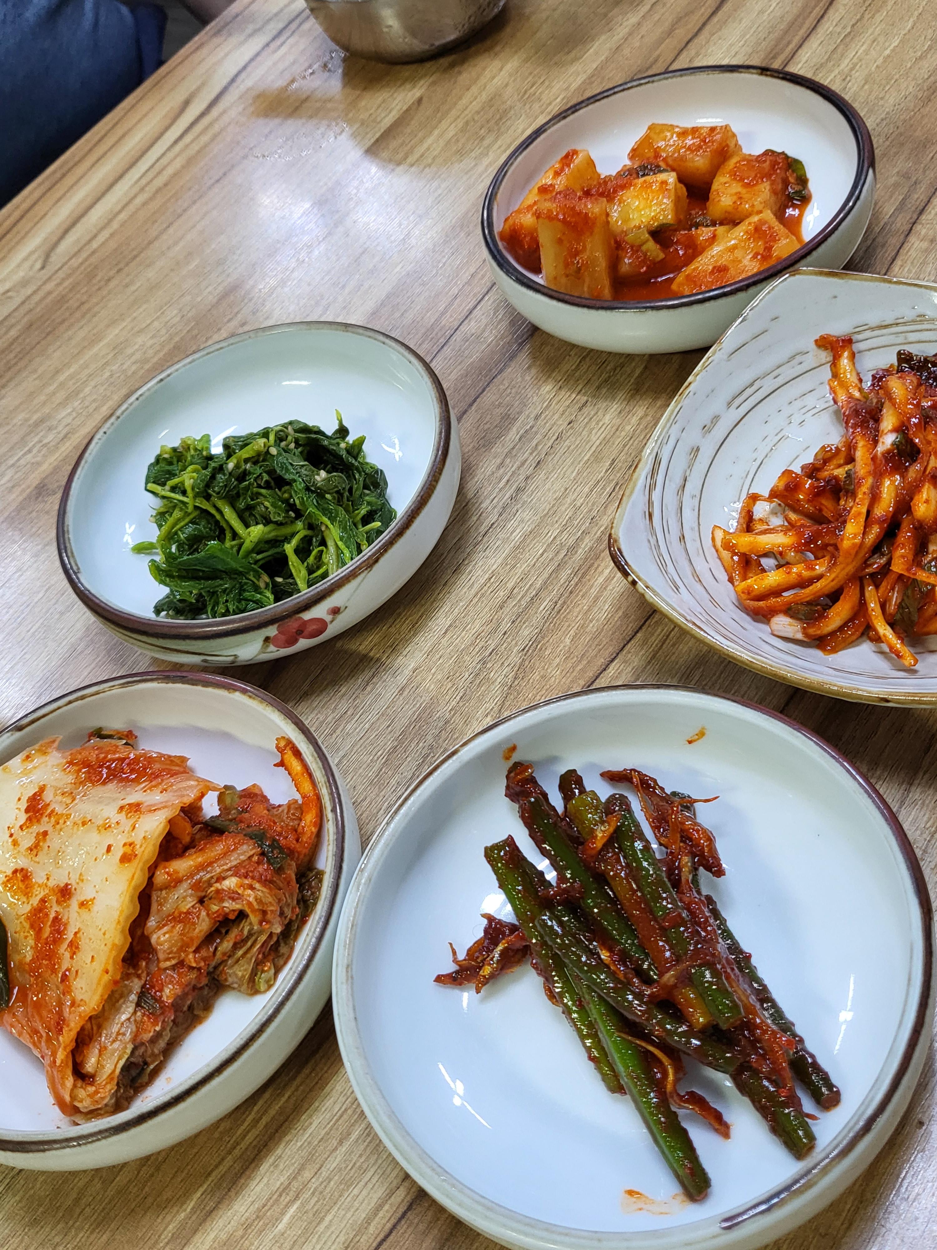 반찬이 정갈하게 잘 나와요. 고춧잎 같은 나물과 마늘쫑무침 맛있었다는^^