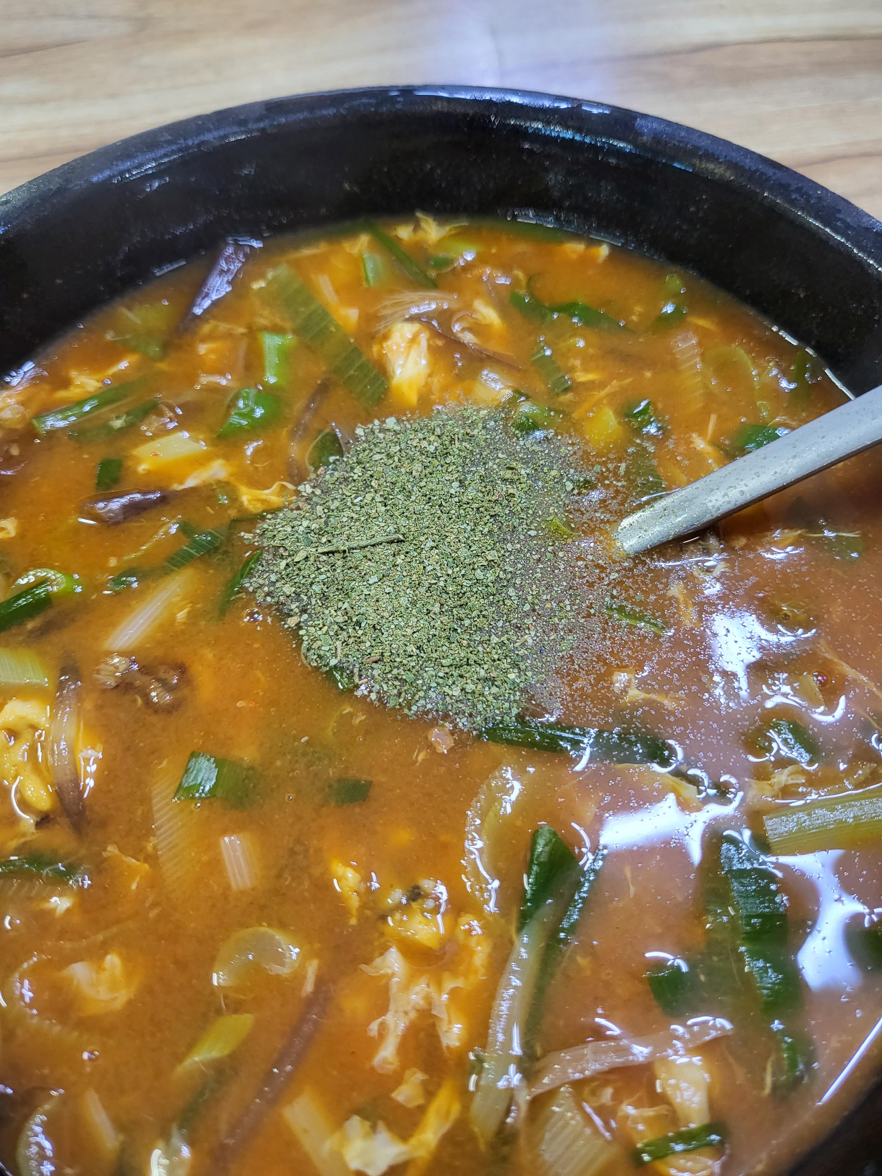 흠... 이건 산초가루였던 것 같은데....ㅎㅎㅎㅎㅎㅎ 정확히 기억이 나지 않아요ㅠㅠㅠ 다만 이 가루를 넣어 먹으니 맛이 더 살아나더라구요.