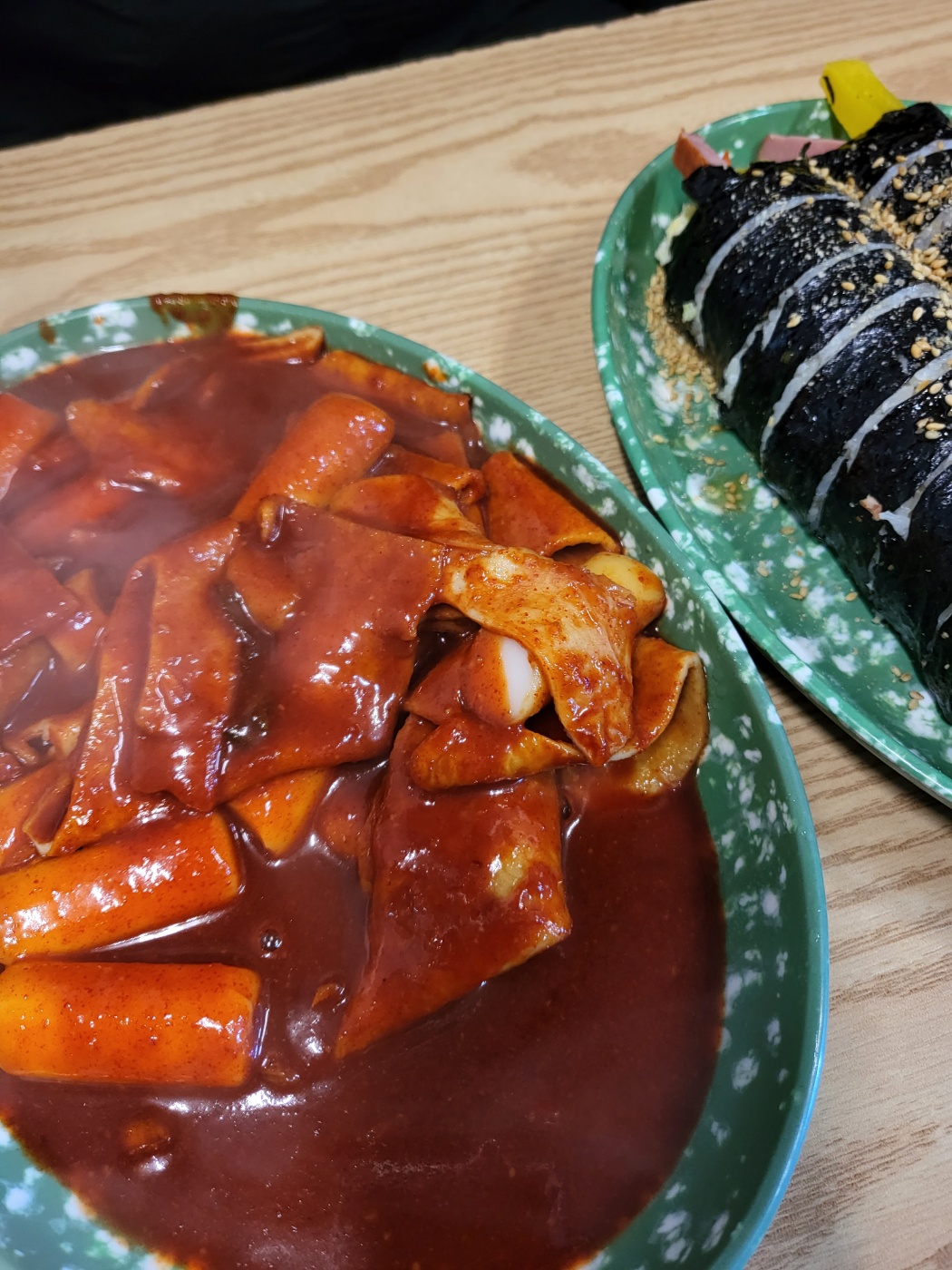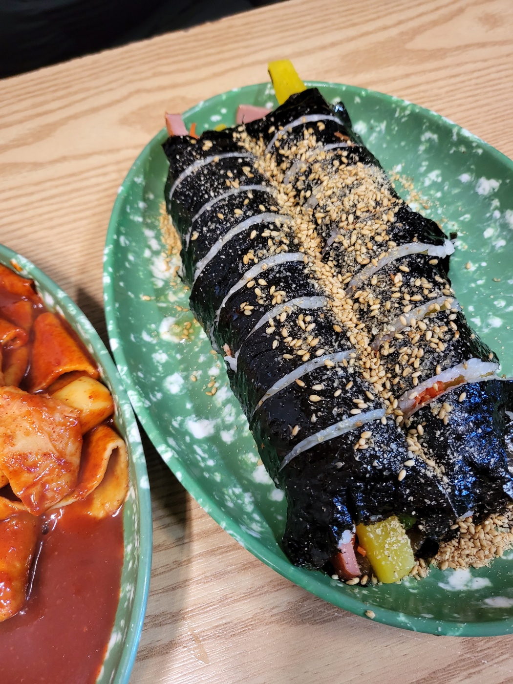 짜잔~ 찐득한 소스가 묻어있는 떡볶이와 깨소금이 올라간 김밥들.